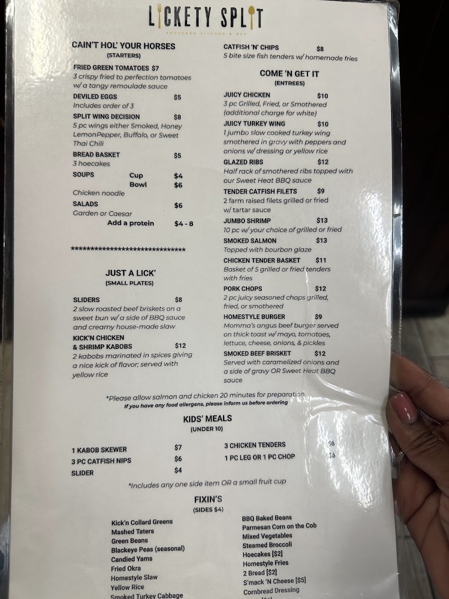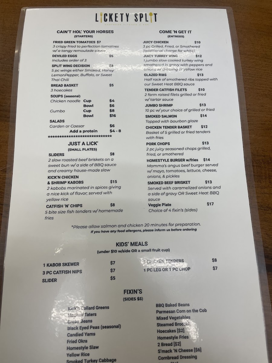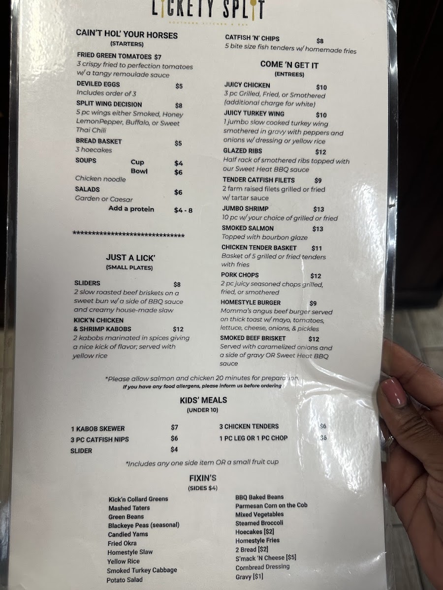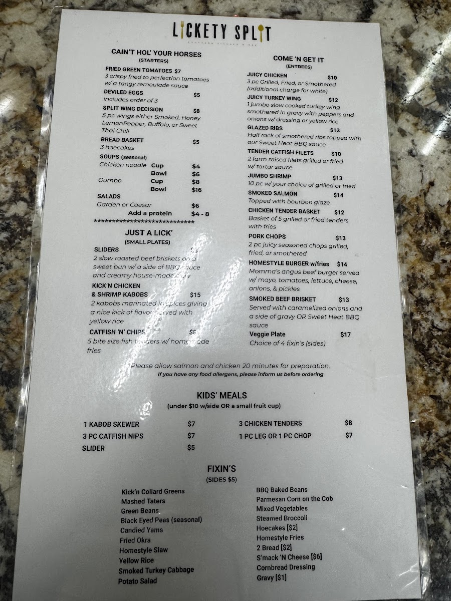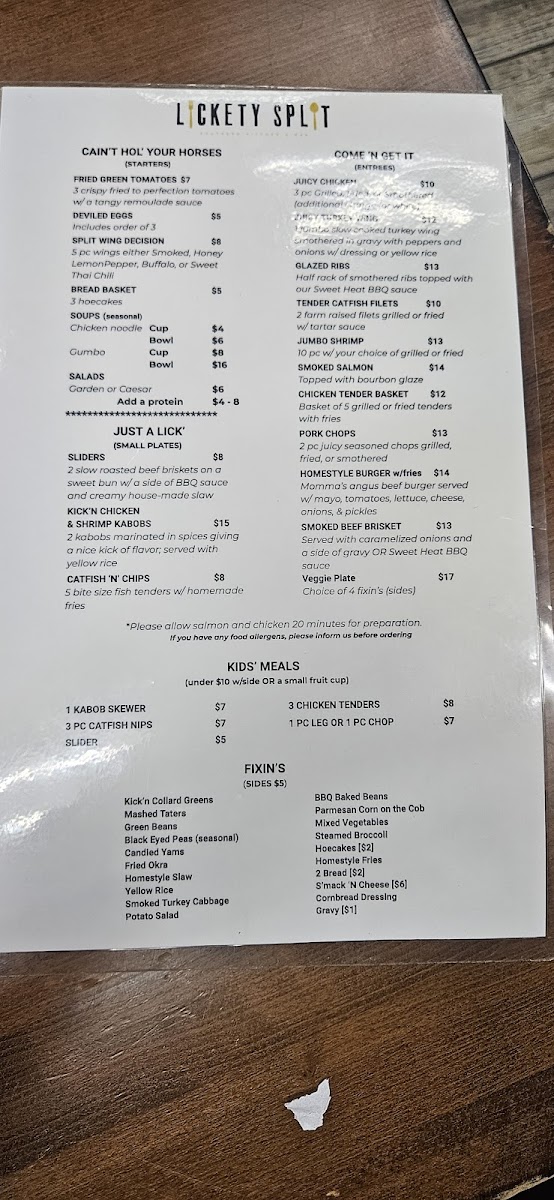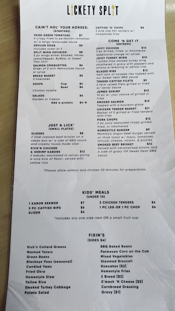 The menu at Lickety Split Southern Kitchen & Bar offers a warm blend of classic Southern soul food and comforting American favorites, crafted to match its easygoing and inviting atmosphere. Whether you're stopping in for a casual lunch, a relaxed dinner, or just grabbing a quick bite, you'll find dishes that feel like home with a little extra charm.